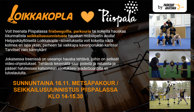 Voit treenata Piispalassa frisbeegolfia, parkouria tai kokeilla hauskaa liikunnallista seikkailusuunnistusta hauskan mobiilipelin avulla! Helppokäyttöisellä Loikkakopla –sovelluksella voit kokeilla näitä kolmea eri lajia yksin, perheen tai vaikkapa kaveriporukan kanssa! Tarvitset vain kännykän!