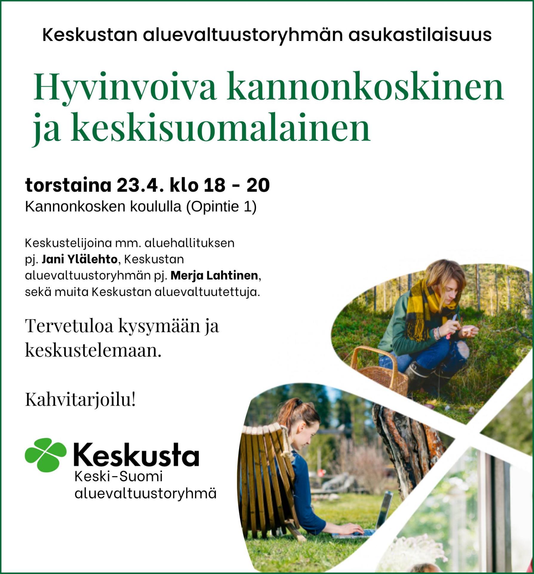 Tule tapaamaan Keskustan aluevaltuustoryhmän jäseniä ensi torstaina 23.4. Kannonkosken koululle klo 18 alkaen.