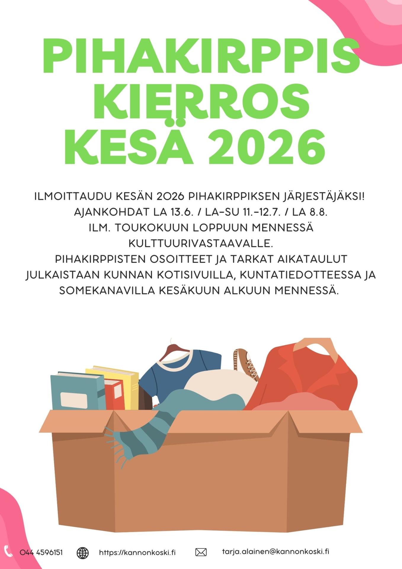 Ilmoittaudu kesän 2026 Pihakirppiksen järjestäjäksi. Ilmoittautuneiden pihakirppisten osoite-, yhteystieto- ja aukioloaikatiedot julkaistaan kunnan kotisivuilla, somekanavilla ja kesäkuun kuntatiedotteessa. Kulttuurivastaava auttaa tapahtumien yhteismarkkinoinnissa. Kunta ei kuitenkaan vastaa varsinaisista kirppiskohteista vaan jokainen järjestäjä rakentaa sen itse.