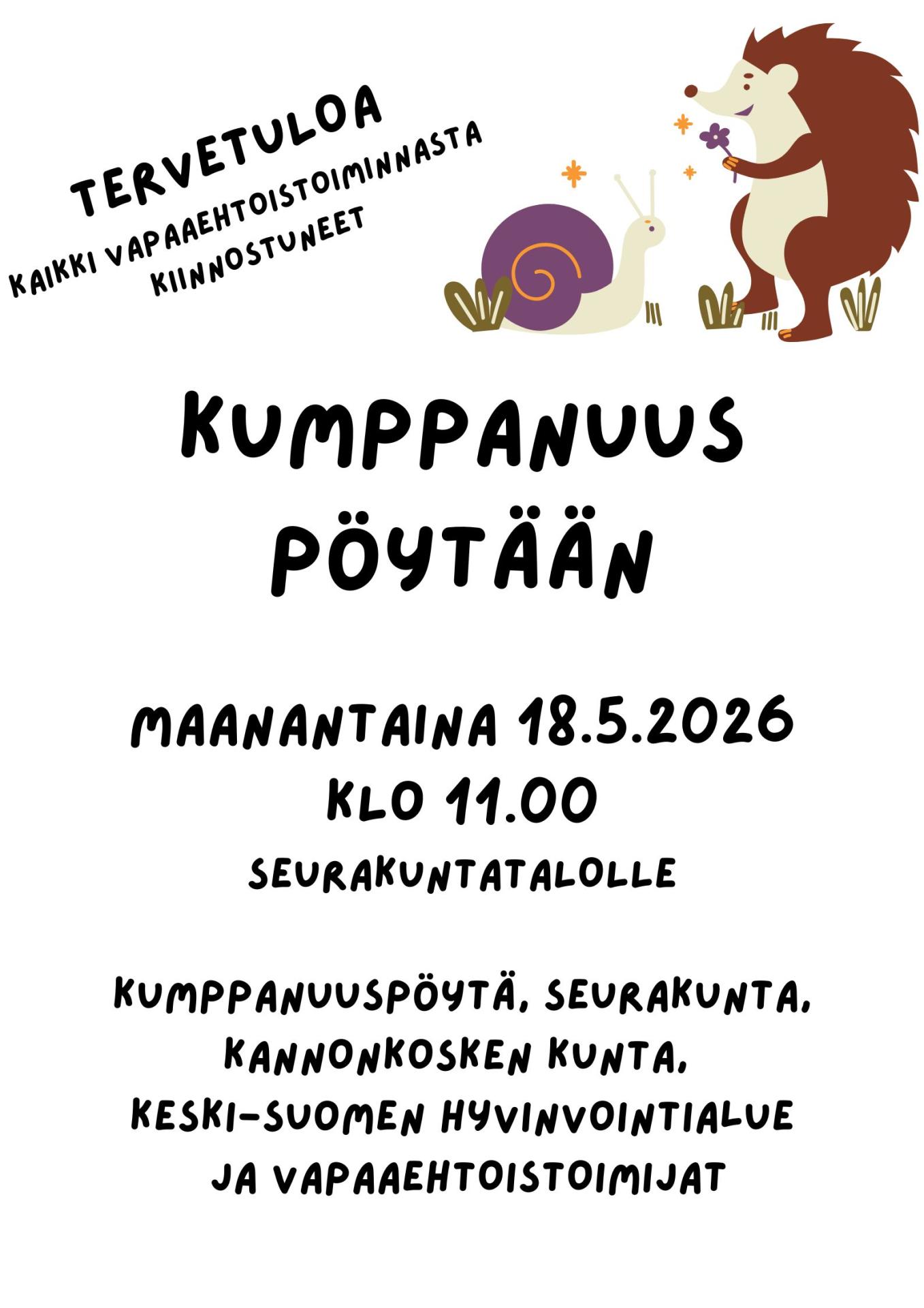 Kumppanuuspöytä kokoontuu jälleen seurakuntatalolla maanantaina 18.5.2026 klo 11 alkaen.