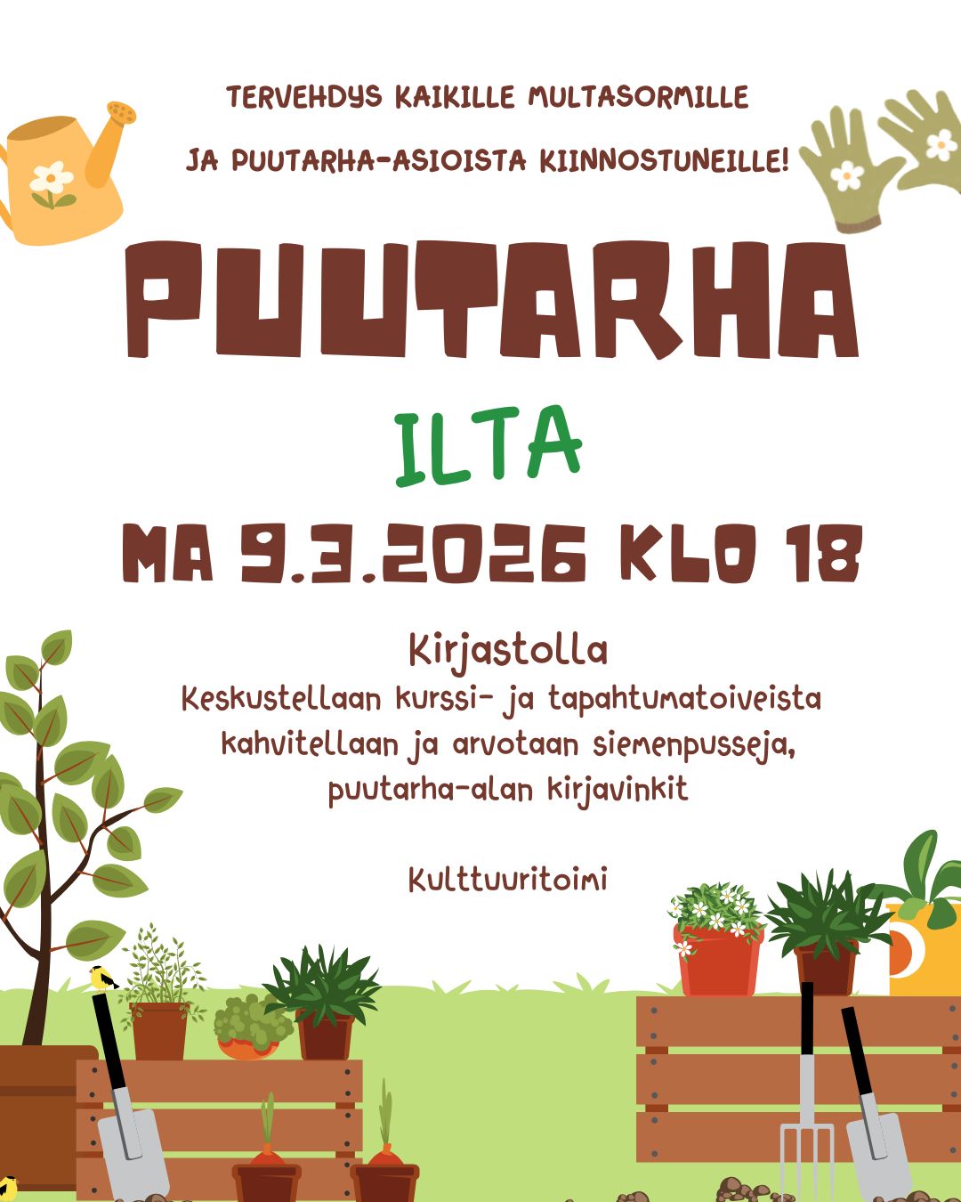 PUUTARHA-ILTA kirjastolla maanantaina 9.3.2026 klo 18.